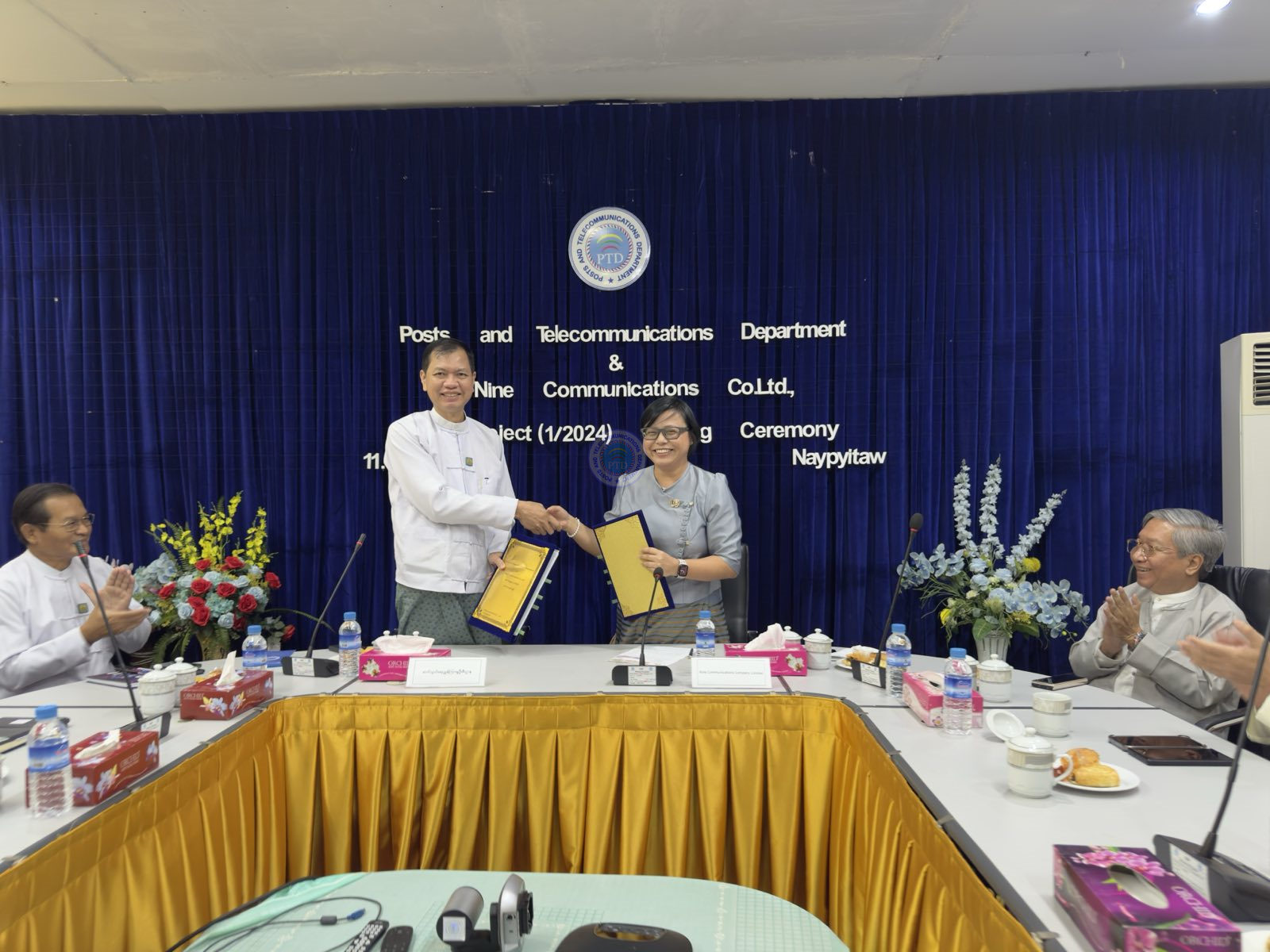 ဆက်သွယ်ရေးညွှန်ကြားမှုဦးစီးဌာနနှင့် Nine Communications Company Limited တို့အကြား အခြေခံဆက်သွယ်ရေးလိုအပ်ချက် ဖြည့်ဆည်းခြင်းဆိုင်ရာရန်ပုံငွေ (USF) ဖြင့် နေပြည်တော်ကောင်စီနယ်မြေ၊ လယ်ဝေးမြို့နယ်၊ လယ်မကျေးရွာတွင် Telecommunication Infrastructure Services, Rural Project (Lot-1) အဖြစ် မိုဘိုင်းတယ်လီဖုန်းဆက်သွယ်ရေးစခန်း(၁)ခု တည်ဆောက်အကောင်အထည်ဖော်ခြင်းအတွက် လုပ်ငန်းအပ်နှံမှုသဘောတူစာချုပ်ချုပ်ဆိုသည့်အခမ်းအနား ကို ၂၀၂၅ ခုနှစ်၊ စက်တင်ဘာလ (၁၁)ရက် (ကြာသပတေးနေ့)၊ နံနက် (၁၁:၀၀) နာရီအချိန်တွင်ဆက်သွယ်ရေးညွှန်ကြားမှုဦးစီးဌာန၊ အစည်းအဝေးခန်းမ၌ကျင်းပပြုလုပ်ခဲ့ရာ ဆက်သွယ်ရေးညွှန်ကြားမှုဦးစီးဌာနညွှန်ကြားရေးမှူးချုပ်၊ ဒုတိယညွှန်ကြားရေးမှူးချုပ်များနှင့် အခြေခံဆက်သွယ်ရေးလိုအပ်ချက်ဖြည့်ဆည်းရေးဌာနမှ တာဝန်ရှိသူများ၊ Nine Communications Company Limited မှ အမှုဆောင်အရာရှိချုပ်နှင့် တာဝန်ရှိသူများ တက်ရောက်ခဲ့ပြီး ဆက်သွယ်ရေးညွှန်ကြားမှုဦးစီးဌာနနှင့် Nine Communications Company Limited တို့အကြား ချုပ်ဆိုမည့် လုပ်ငန်းအပ်နှံမှု သဘောတူစာချုပ်အား သက်ဆိုင်ရာတာဝန်ရှိသူများမှ လက်မှတ်ရေးထိုးခဲ့၍ အခမ်းအနားအား နေ့လယ် (၁၂း၀၀) နာရီအချိန်တွင် ရုတ်သိမ်းခဲ့ပါသည်။